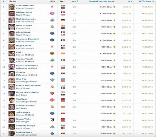 2025年身價(jià)上漲榜:伊薩克奧利塞飆升6500萬歐,登貝萊漲4500萬歐