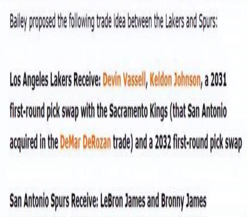 “湖人送出詹姆斯+布朗尼,換到瓦塞爾、凱爾登·約翰遜,外加兩個(gè)未來首輪互換權(quán)。”