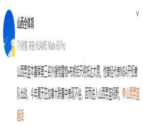 格雷格-布朗是一名非常年輕的球員,今年只有24歲,身高2米01主打鋒線。格雷格-布朗的能力非常全面,高中時曾被美媒評為五星高中生。在2021年的NBA選秀大會上,格雷格-布朗在次輪第43順位被新奧爾良鵜鶘隊(duì)選中,隨后被交易到了開拓者。此后的三年時間里,格雷格-布朗先后在開拓者和獨(dú)行俠效力,總共打了70場比賽,能夠在場均出戰(zhàn)11分鐘時間里3.8分2.3個籃板的數(shù)據(jù)。在23-24賽季,格雷格-布朗跟隨獨(dú)行俠獲得了NBA聯(lián)賽的亞軍。不過在賽季結(jié)束后,格雷格就離開了NBA前往加拿大打球,在今年夏天打出了非常不錯的表現(xiàn),引起了山西男籃的關(guān)注。經(jīng)過多次溝通后,山西男籃和他完成了簽約。