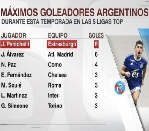 阿爾瓦雷斯曾在西甲第6輪面對(duì)巴列卡諾的比賽中戴帽,緊接著與皇馬的比賽梅開二度,他原本是五大聯(lián)賽進(jìn)球最多的阿根廷球員,但最近未能開張,已經(jīng)被效力于斯特拉斯堡的阿根廷球員帕尼切利反超。在法甲第9輪比賽中,帕尼切利甩頭攻門攻破了里昂球門,幫助球隊(duì)領(lǐng)先,但之后斯特拉斯堡又是烏龍,又是送點(diǎn),還有球員被罰下,10人作戰(zhàn)的斯特拉斯堡被里昂逆轉(zhuǎn),以1-2失利。