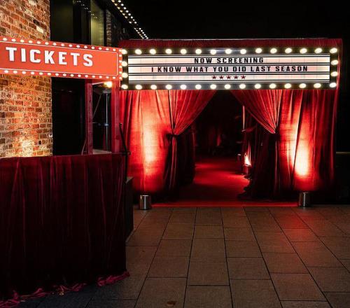 客人們?cè)谝粋€(gè)電影院風(fēng)格的入口受到迎接,紅色的帷幕和一個(gè)發(fā)光的標(biāo)志宣布著當(dāng)晚的主題。