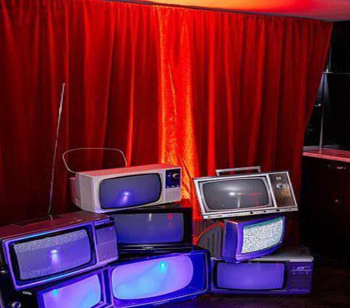 內(nèi)部,一堆老式電視機(jī)在紅色的燈光下閃爍,墻上貼滿了“通緝令”海報(bào)