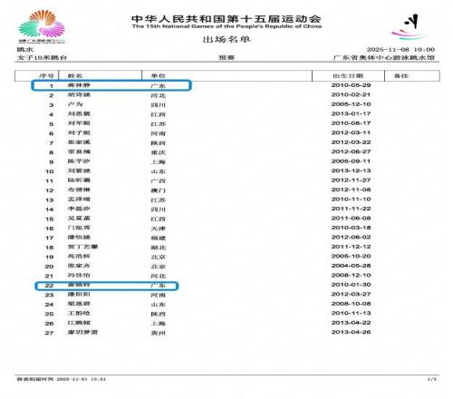 北京時間11月1日,全運會官網(wǎng)發(fā)布了11月8日女子10米臺預賽的27人參賽名單,全紅嬋并不在列,廣東隊派出兩位出生于2010年的小將蔣林靜、謝佩鈴。這意味著,全紅嬋不會參加2025全運會女子10米臺單人項目的比賽,也就無緣實現(xiàn)全運會女子10米臺兩連冠。