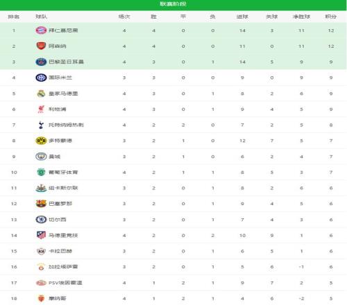 隨著拜仁21巴黎,利物浦10皇馬,歐冠最新積分榜:阿森納升第二