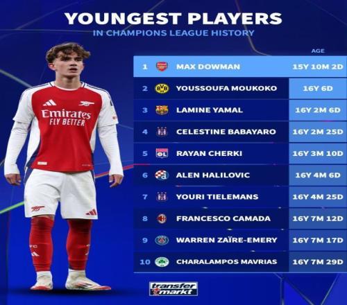 至此,槍手成為1969-70賽季的利茲聯(lián)后,史上第2支在單季歐冠前4場比賽全勝且不失一球的英格蘭球隊(duì)。此外,槍手還貢獻(xiàn)了一個(gè)歷史之最:小將道曼此役替補(bǔ)登場,超越穆科科和亞馬爾等人,以15歲308天的年齡,成為冠軍聯(lián)賽歷史上最年輕的出場球員。