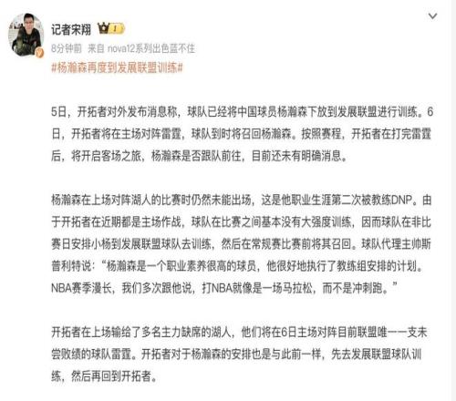 根據(jù)最新消息,開拓者官宣球隊(duì)從發(fā)展聯(lián)盟再次召回了楊瀚森,屆時(shí)將在明日主場對(duì)陣?yán)做?。這則消息從字面上來看,對(duì)于楊瀚森來講是有利的,似乎開拓者是為了保證楊翰森的訓(xùn)練才下放他的。但事實(shí)真的如此嗎?我們尚未可知。