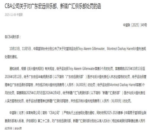 CBA官方:吉倫沃特哈雷爾興奮劑違規(guī)廣東新疆扣6分核減經費60萬