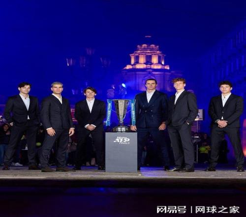 拍攝在都靈的夜間進行,實際的拍攝效果非常出色,激光束、閃耀的藍光,以及置于照片中央的ATP總決賽獎杯共同構成了畫面。獎杯象征著球員們一年以來努力爭取的榮耀——那是一座高大的銀色獎杯,寬闊的杯耳、銳利的線條和ATP 的標志一目了然。鏡頭里的所有布景都很完美,唯一的問題就是幾張關鍵面孔的明顯缺席。當然,阿爾卡拉斯和辛納依舊以深色西裝和自信的笑容搶盡風頭。
