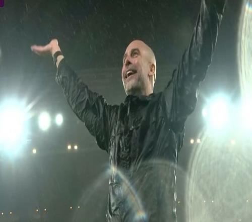 第63分鐘,多庫(kù)禁區(qū)外轟出世界波,迎來(lái)執(zhí)教生涯1000場(chǎng)里程碑的瓜帥在雨中張開(kāi)雙臂,縱情慶祝。