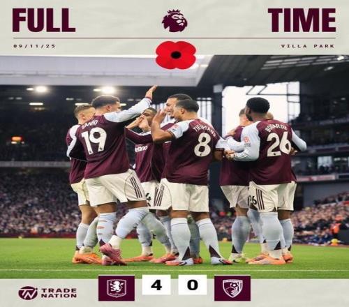 英超第11輪,阿斯頓維拉主場(chǎng)迎戰(zhàn)伯恩茅斯。第28分鐘,布恩迪亞禁區(qū)前沿任意球直接破門。第40分鐘,阿馬杜·奧納納遠(yuǎn)射擴(kuò)大比分。第64分鐘,羅杰斯手球送點(diǎn),埃米利亞諾·馬丁內(nèi)斯神勇?lián)涑鋈纺釆W點(diǎn)球。第77分鐘,巴克利前點(diǎn)接迪涅右路角球,頭球后蹭破門。第82分鐘,馬倫禁區(qū)前沿低射折射入網(wǎng)。維拉4比0大勝,18分暫列第7。櫻桃軍團(tuán)遭遇自5月以來首次聯(lián)賽連敗,5月先輸維拉后負(fù)曼城,11月先輸藍(lán)月再負(fù)維拉。