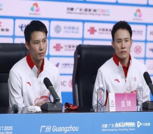 陳艾森(左)、謝思埸在廣東隊(duì)奪得本屆全運(yùn)會(huì)跳水男團(tuán)冠軍后參加新聞發(fā)布會(huì)。南都N視頻記者 黎湛均 攝
