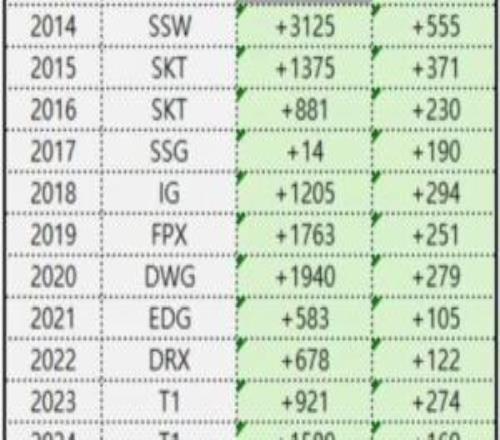 體育資訊11月10日報道宣稱 昨日S15全球總決賽上,T1擊敗KT奪得冠軍,賽后韓網整理歷年S賽冠軍的前15分經濟差,其中今年T1是唯一一支負15分經濟差奪冠的隊伍!