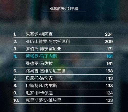 本場比賽的進球,也讓勞塔羅的藍黑軍團生涯進球總數(shù)來到161球,國米隊長與藍黑名宿馬佐拉一起,目前并列位居國米隊史第四射手的寶座。這位阿根廷射手,正用一個個進球,一步步將自己鑄就成為俱樂部的活傳奇。