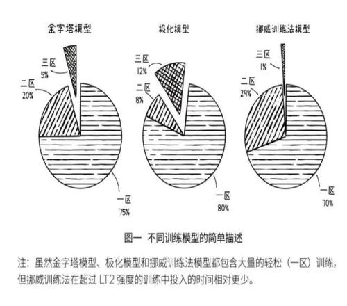 而更為獨(dú)特的,是挪威訓(xùn)練法分配到三個區(qū)的訓(xùn)練量(圖二),其中70%的跑量為輕松跑,象征性地用1%左右的跑量進(jìn)行無氧閾值以上的超高強(qiáng)度訓(xùn)練,剩下的不到30%跑量留給有氧閾值和無氧閾值之間的混合區(qū)域。