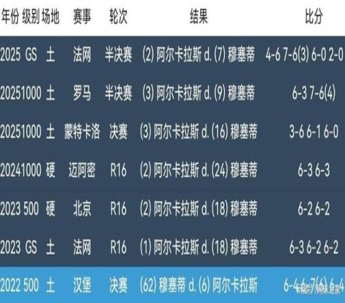 阿爾卡拉斯當(dāng)然有理由興奮,畢竟他和穆塞蒂兩人職業(yè)生涯至今交鋒七次,六勝一負(fù)遙遙領(lǐng)先。2022年ATP250烏瑪格站決賽,阿爾卡拉斯三盤(pán)不敵穆塞蒂,輸?shù)袅藘扇寺殬I(yè)生涯首次交鋒。此后六次交鋒,包括四次紅土、兩次硬地交鋒,阿爾卡拉斯全部戰(zhàn)勝對(duì)手,其中今年就是三次紅土交鋒。