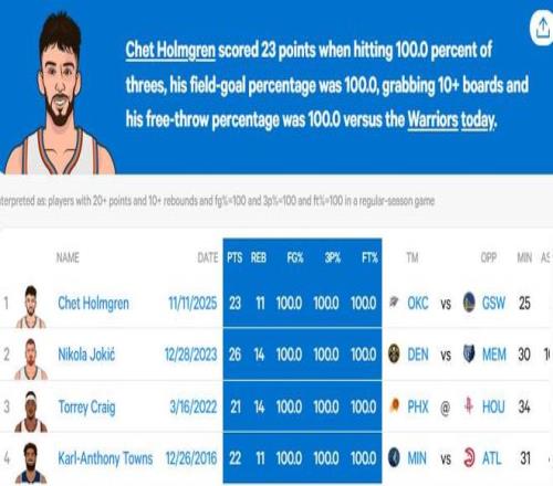 據(jù)統(tǒng)計,切特是NBA歷史上第四位在單場比賽中所有投籃命中率均為100%并得到至少20分10籃板的球員,在他之前三位球員是唐斯、克雷格和約基奇。