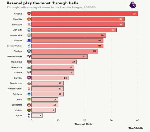 競技網(wǎng)提供的一組更微觀的數(shù)據(jù)或許能夠說明一些問題:在直傳球方面,阿森納是開季以來的英超“冠軍”,共計送出40次直傳,緊隨其后的是曼聯(lián)和利物浦(各35次),這一榜單墊底的是槍手的北倫敦死敵熱刺,只有4次!